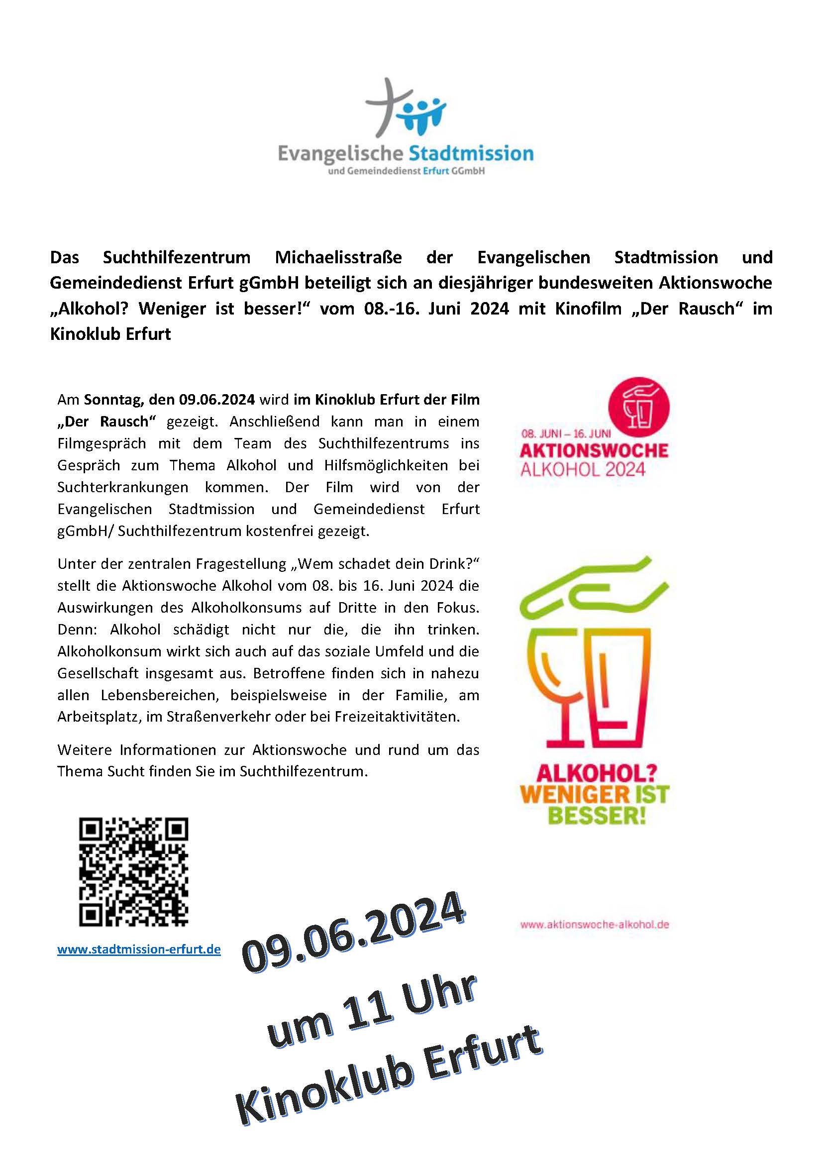 Das Suchthilfezentrum Michaelisstraße der Evangelischen Stadtmission und Gemeindedienst Erfurt gGmbH beteiligt sich an diesjähriger bundesweiten Aktionswoche „Alkohol? Weniger ist besser!“ vom 08.-16. Juni 2024 mit Kinofilm „Der Rausch“ im Kinoklub Erfurt
