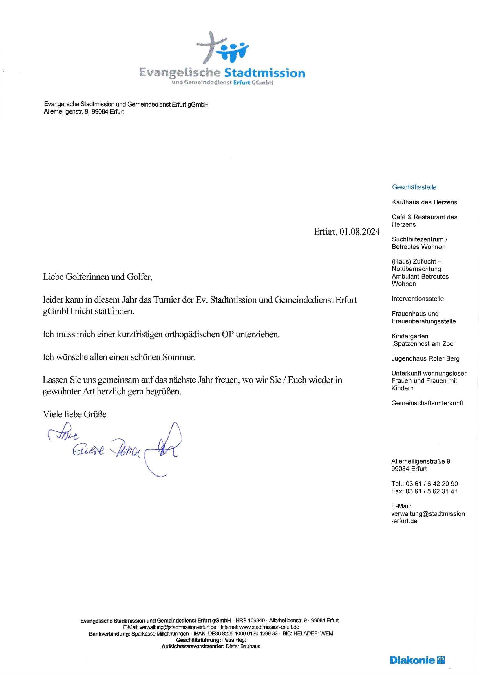 Mit großem Bedauern müssen wir unser traditionelles Stadtmissions-Golfturnier für dieses Jahr absagen. Das Charity-Golfen mit weit über 70 Teilnehmern ist eins unser großen Spenden-Events und ein wichtiger Beitrag zur Finanzierung des „Restaurant des Herzens“ in den Wintermonaten. Viele Freunde des Golfsports finden dafür in Mühlberg jährlich zusammen, um mit ihren Startgeldern und Spenden diese Aktion des Herzens zu unterstützen.