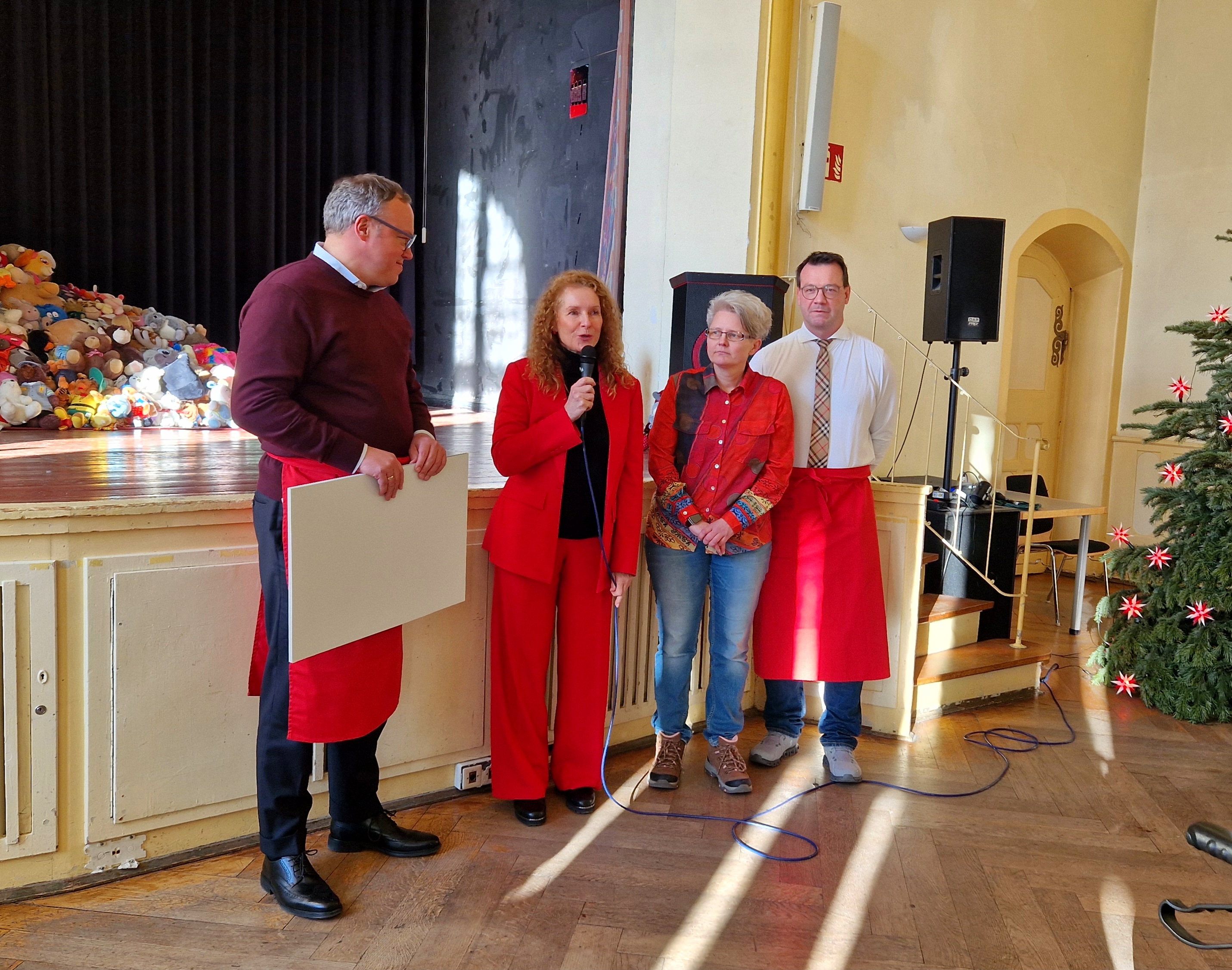 Apfelsinen zur Begrüßung, Bratklops mit Kartoffeln und Gemüse – dies stand gestern auf der Speisekarte. Der MP half fleißig mit, empfing jeden Gast am Einlass persönlich und servierte dann in der traditionellen roten Schürze der Ev. Stadtmission das Essen. Unsere Gäste fühlten sich sehr geehrt über den Besuch.