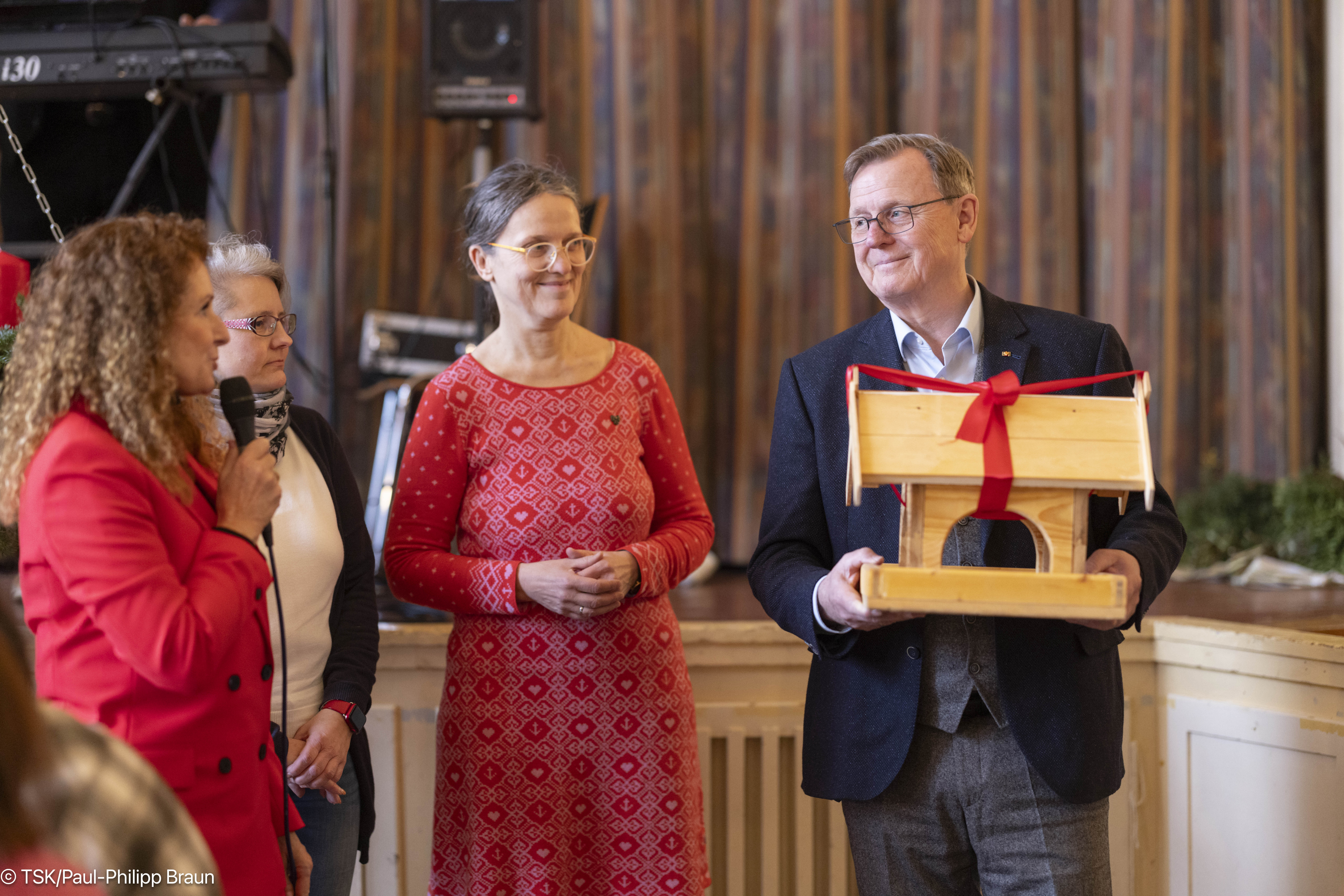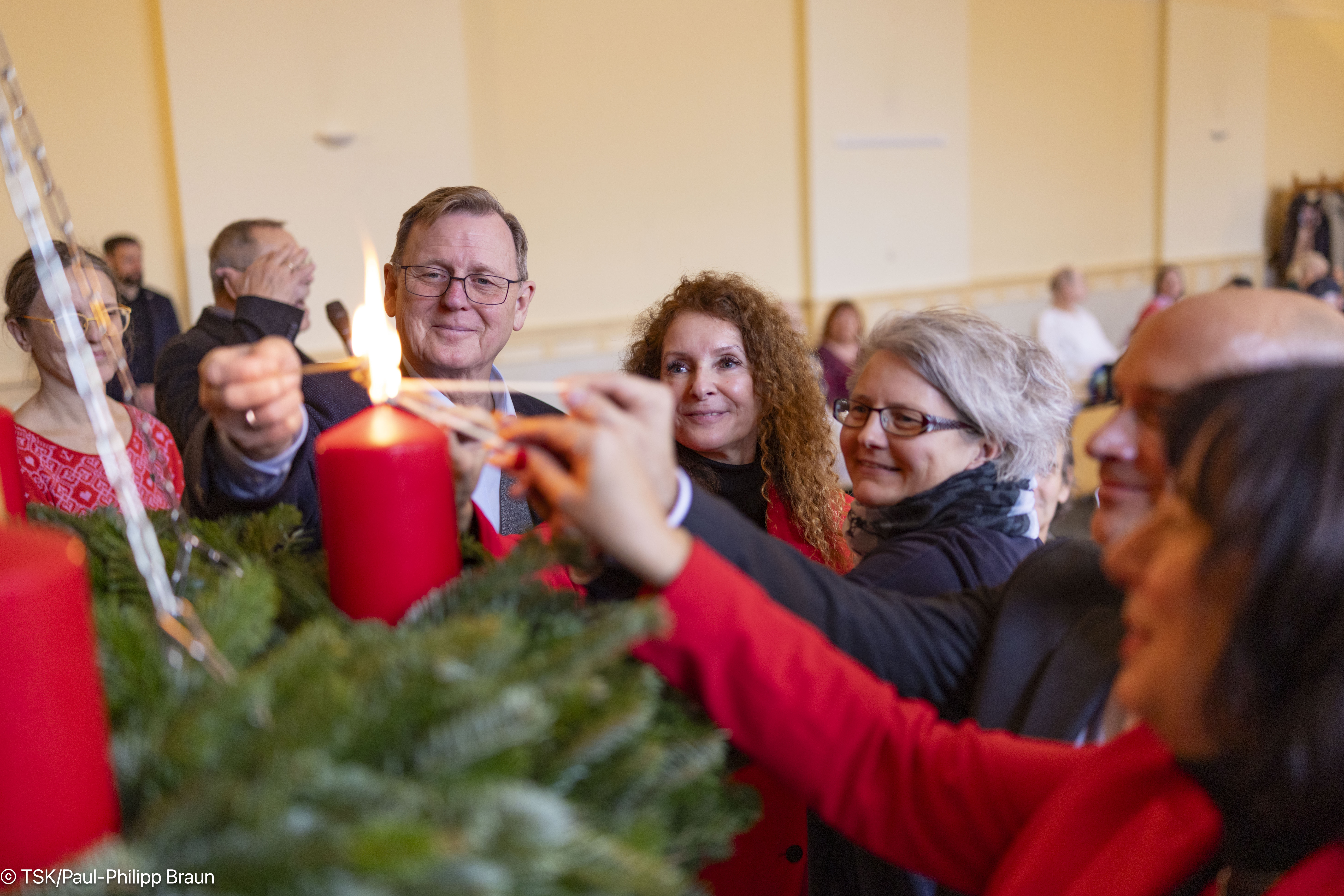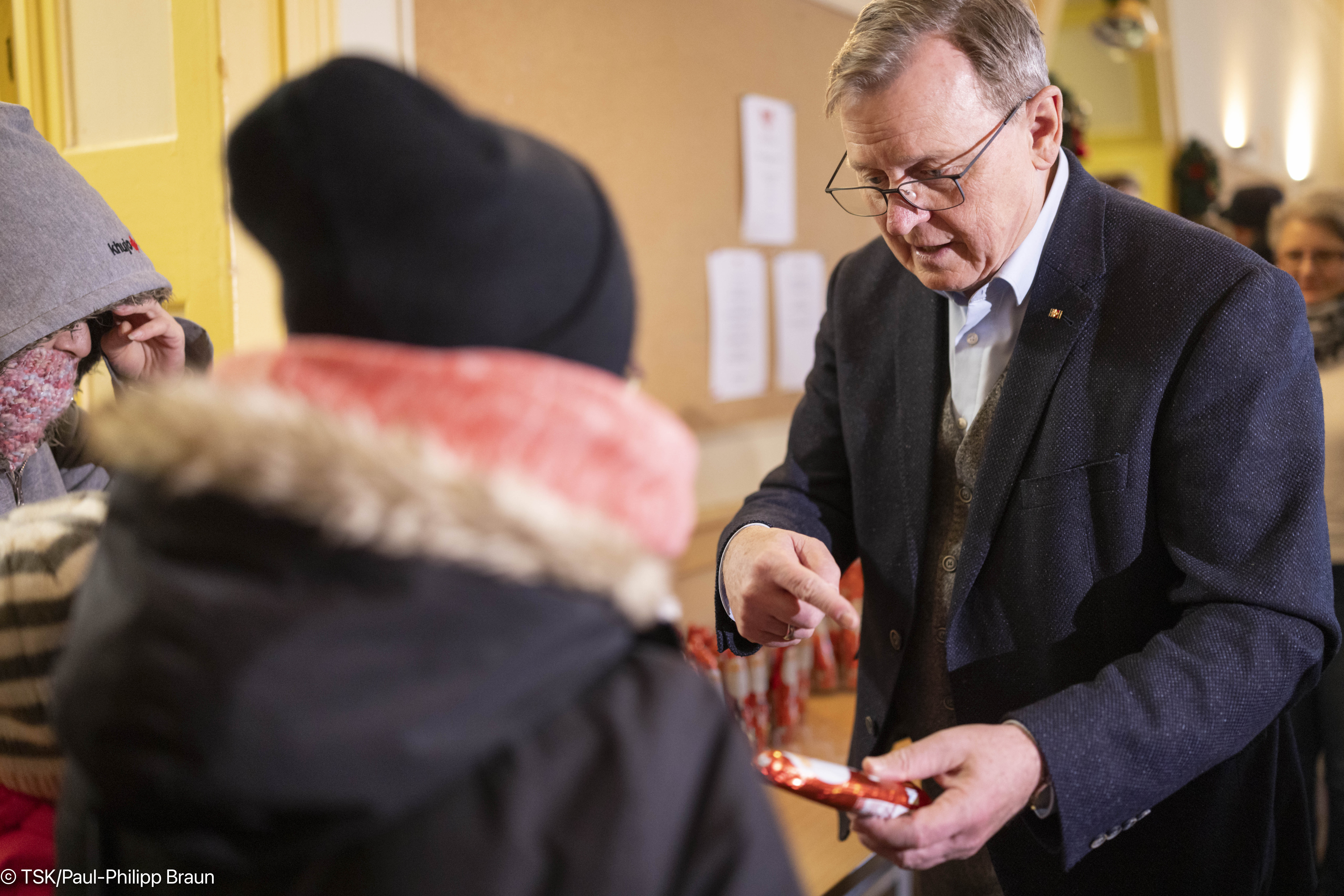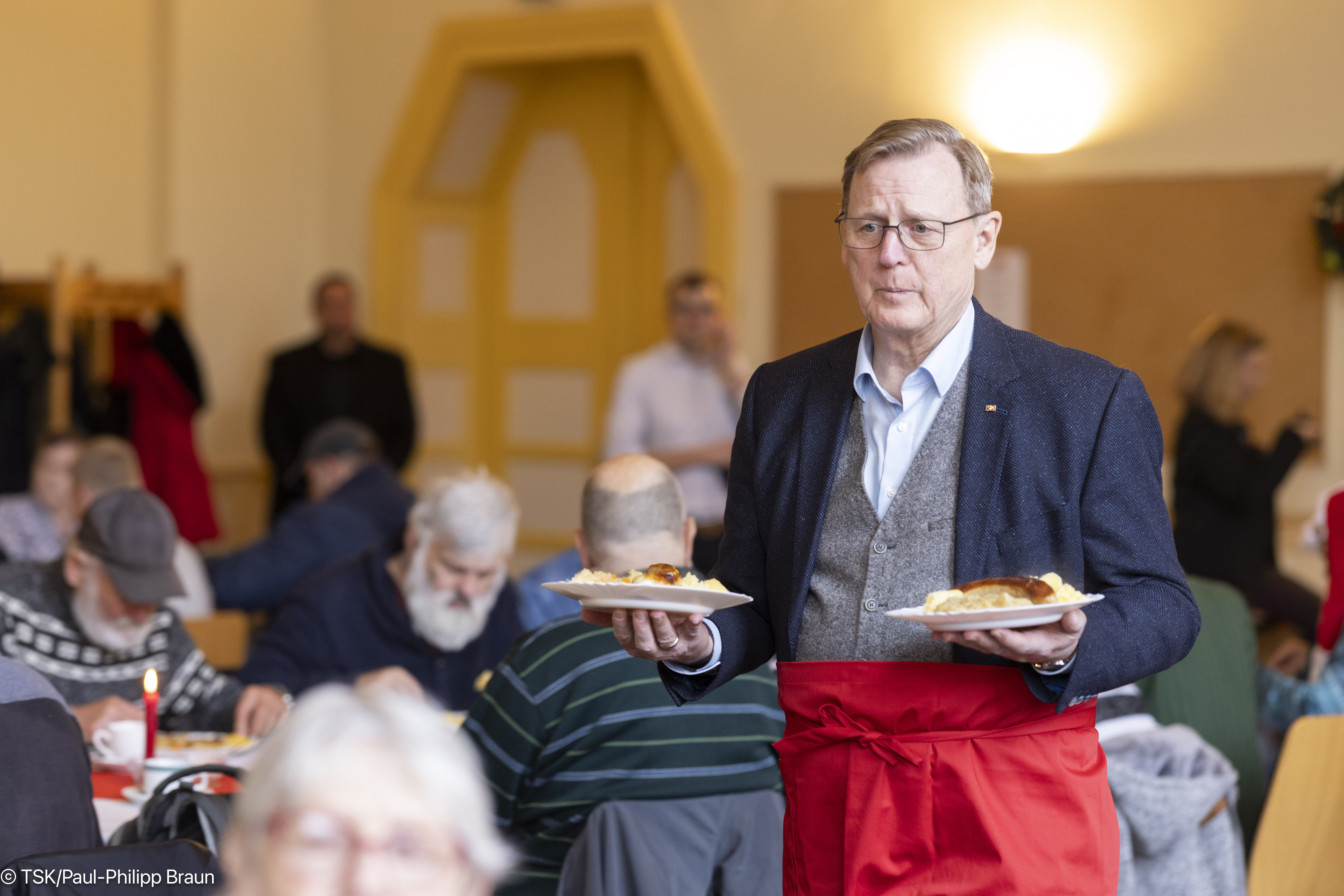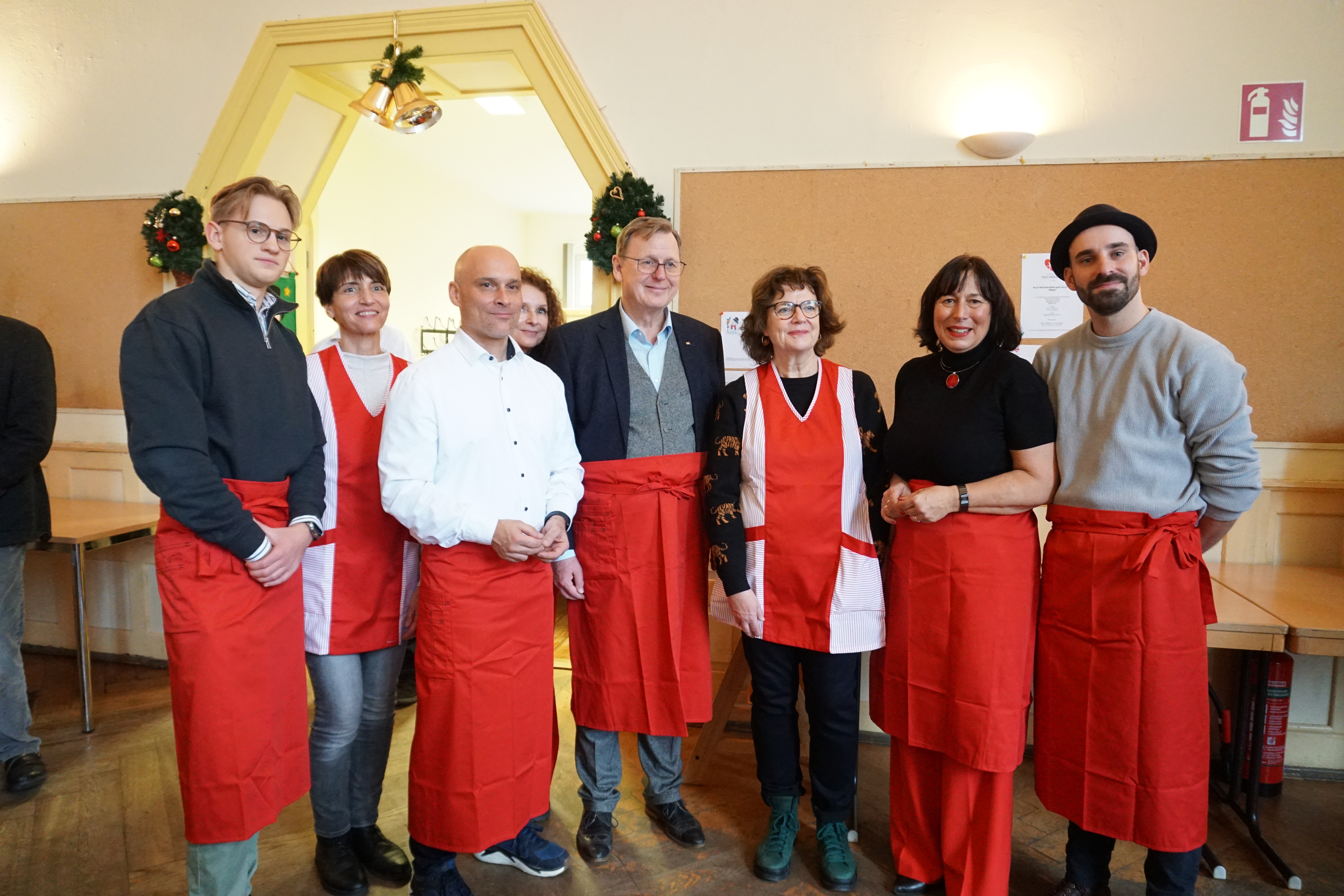 Eingespielte Routine, im positiven Sinne. „Das beginnt bei der Verlässlichkeit von Spendern, ohne die dieses Sozialprojekt gar nicht möglich wäre.“ Auch die ehrenamtliche Unterstützung ist nach dem Pandemie-Bruch wieder gut angelaufen. „Das ist in jedem Jahr eine große Sorge“, sagt Restaurantleiterin Jana Keil. „Finden wir genügend Freiwillige, um die zwei Monate abzudecken?“ Inzwischen kann sie aufatmen. Die Dienstpläne sind zumindest bis Jahresende strukturiert. Im „Haus Zuflucht“ helfen Freiwillige beim Gemüseschnippeln. Im Restaurant selbst haben sich viele Menschen gemeldet, die einmal oder regelmäßig servieren helfen. Am Eröffnungstag war neben Bodo Ramelwo, letztmalig Schirmherr der Aktion, erstmals Erfurts OB Andreas Horn dabei, EU-Abgeordnete Marion Walsmann, eine Vertreterin des Service-Clubs Soroptimisten sowie Schüler und Lehrer der Sebastian-Lucius-Schule, die während der gesamten Restaurantzeit regelmäßig helfen werden.